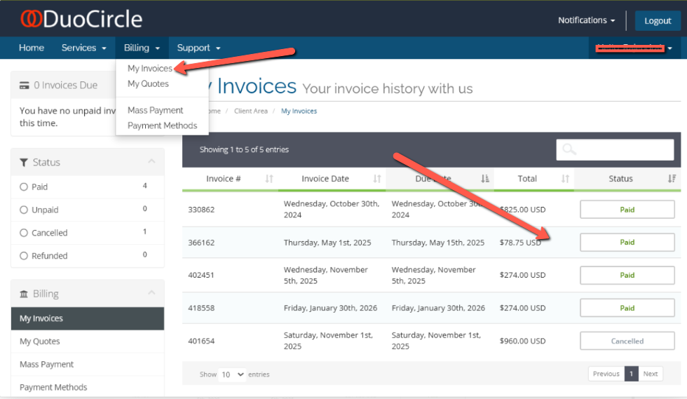 - Click on the Billing menu item >> My Invoices