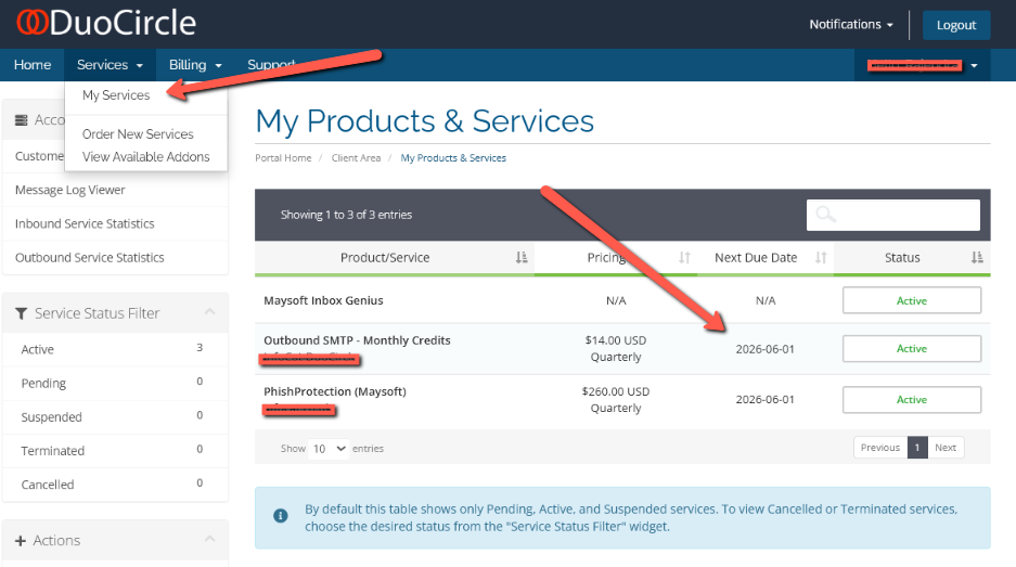 - On the top menu, click Services >> My Services.