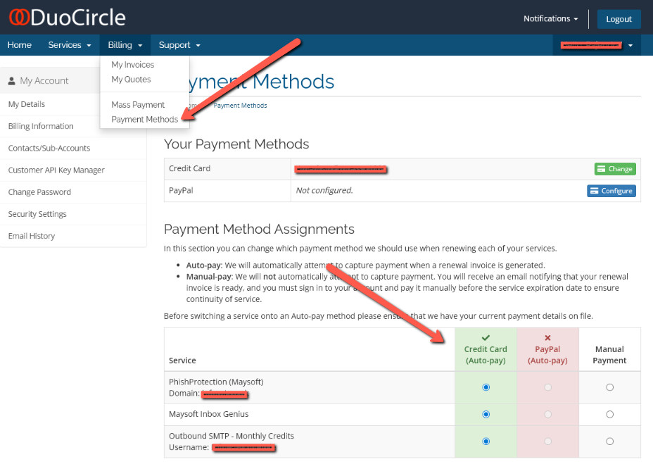 - On the top menu, click Billing >> Payment Methods.